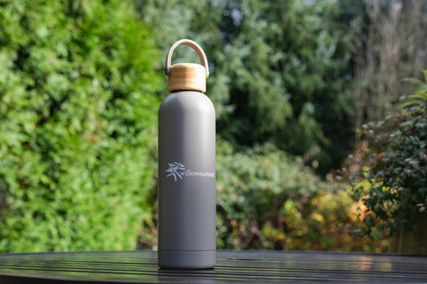 Stylish, minimalist water bottle made of vacuum-insulated stainless steel to keep your drinks hot for 12 hours and cold for 24 hours. Features a twist-on bamboo lid with silicone strap and durable powder coating. Hand wash only, do not microwave. This water bottle comes in black or gray with a white Willows Lodge logo.